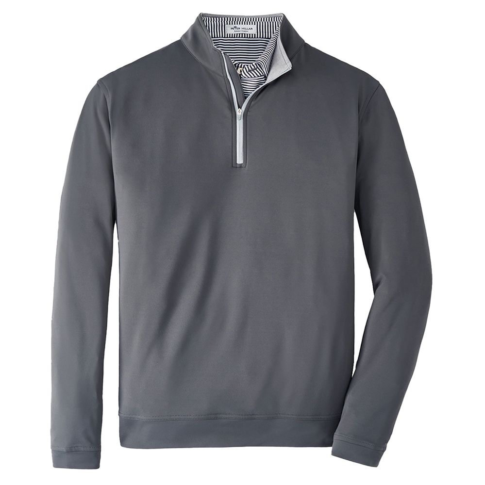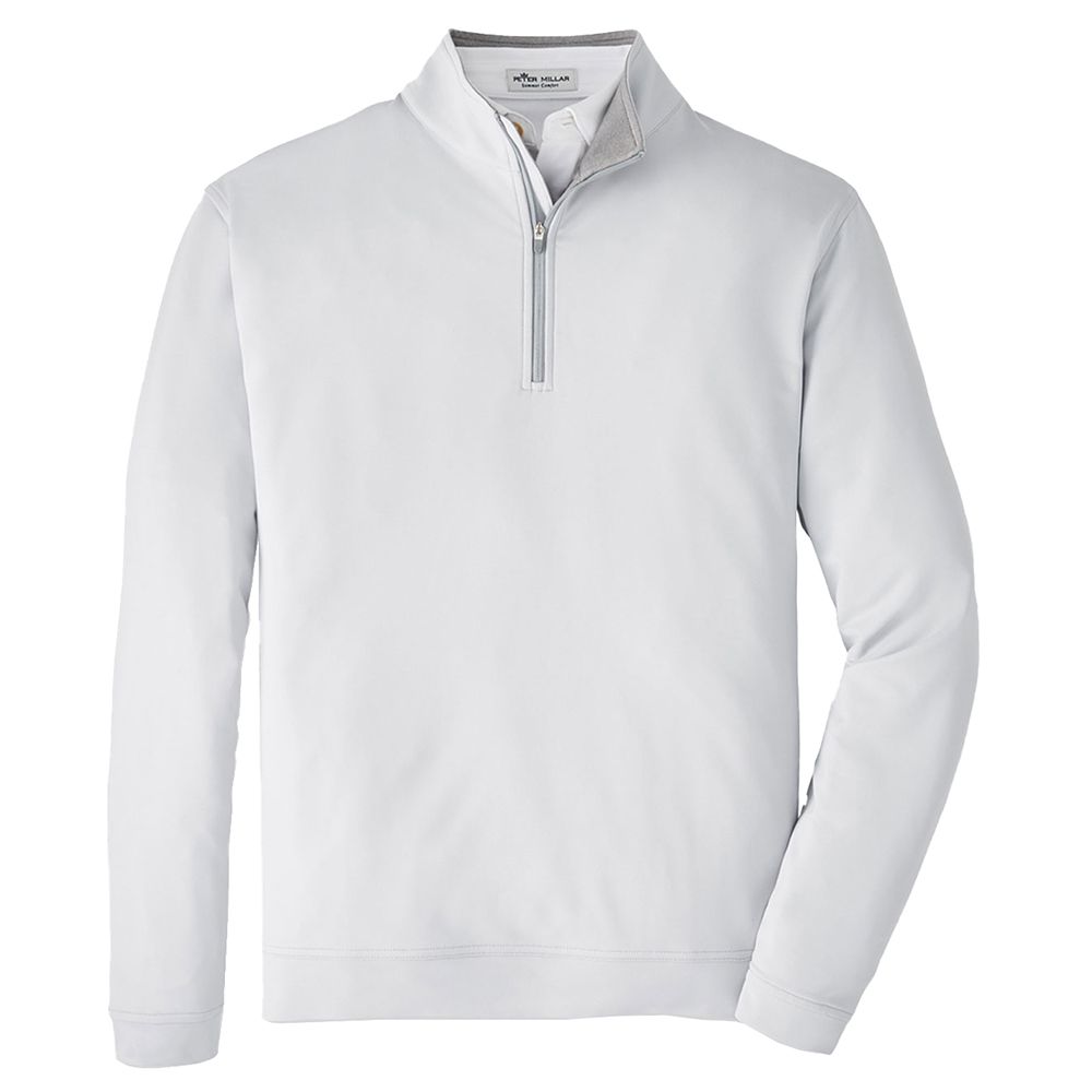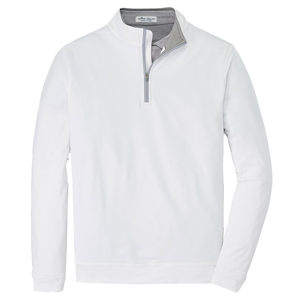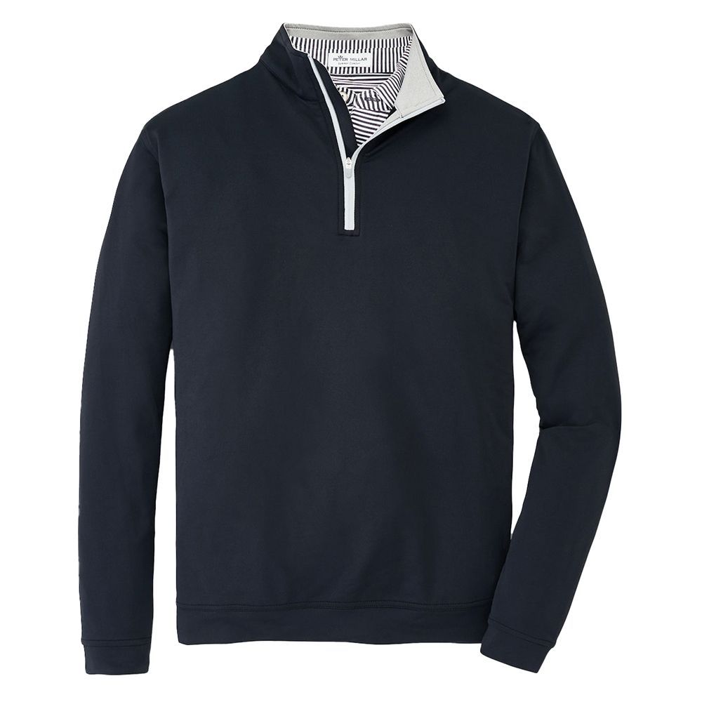 The Perth quarter-zip is made from a signature high-tech loop terry fabric that offers four-way stretch, two-yarn moisture-wicking for quickly drying, UPF 50+ sun protection and easy-care. Styled with a print zipper, mock collar, banded cuffs and hem. 89% microfiber polyester / 11% spandex. Classic fit. Stretch French terry. Peter Millar logo on back yoke. Machine wash cold with like colors; tumble dry low.